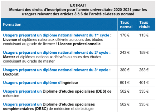 L’arrêté du 19 avril 2019 relatif aux droits d’inscription dans les établissements publics d’enseignement supérieur, modifié par arrêté le 9 juin 2020 et consolidé le 10 juillet 2020, fixe les droits d’inscription pour l’année universitaire 2020-2021.